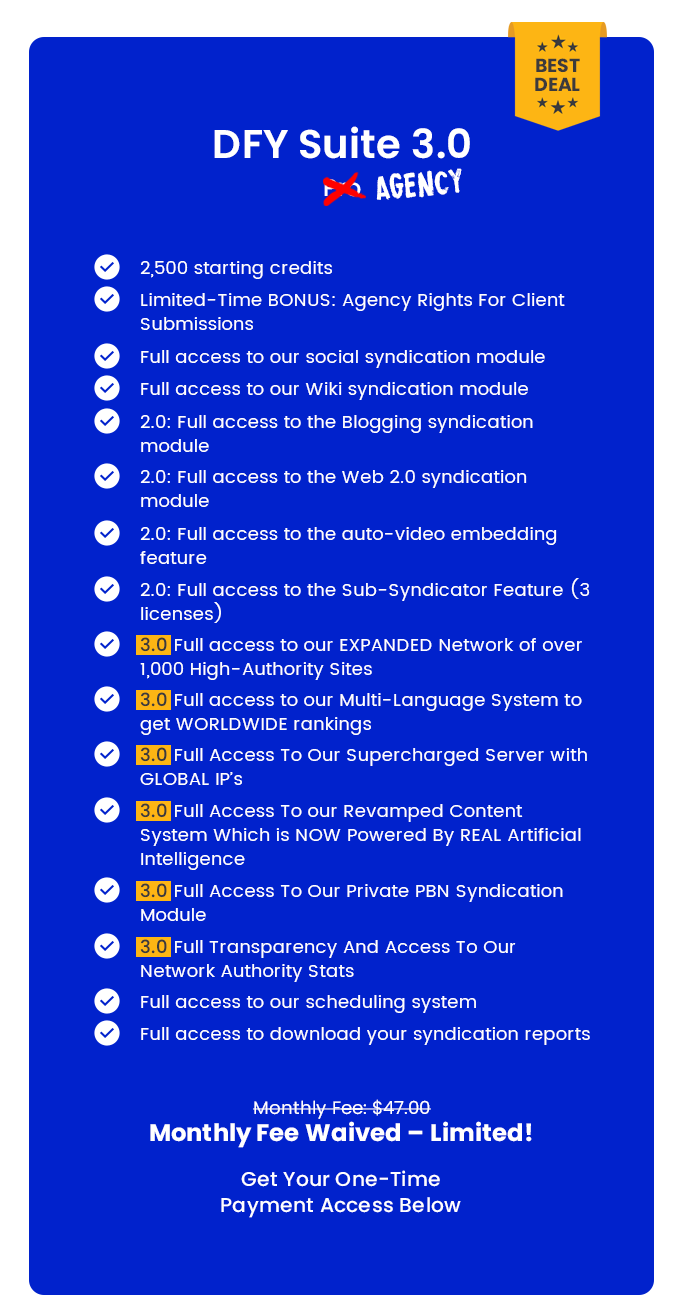So it makes the most sense to try it right now, where you can lock in access to DFY Suite for one small investment.