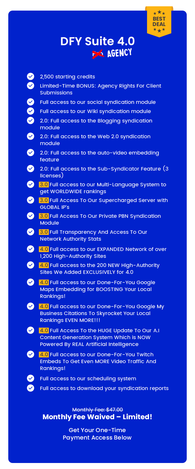 So it makes the most sense to try it right now, where you can lock in access to DFY Suite for one small investment.